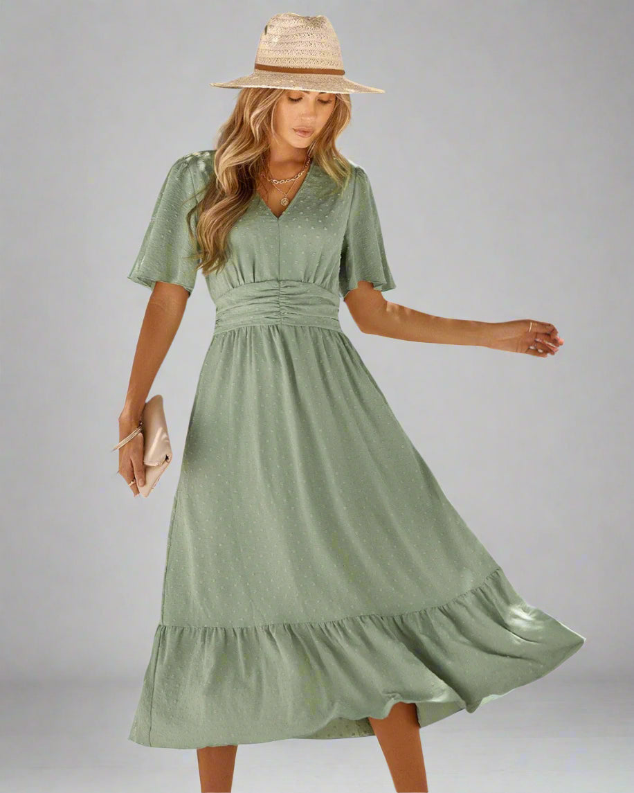 Soms vind je een jurk die gewoon alles heeft. De perfecte pasvorm, de subtiele details en het gevoel dat je straalt – zonder dat je daar moeite voor hoeft te doen. Deze stijlvolle V-hals jurk is jouw nieuwe favoriete item voor zonnige dagen, ontspannen momenten en spontane uitjes. De zachte stof beweegt luchtig om je heen, terwijl het gesmokte middel je silhouet prachtig laat uitkomen. Met haar romantische uitstraling en nonchalante charme is deze jurk gemaakt om in te leven én te schitteren.