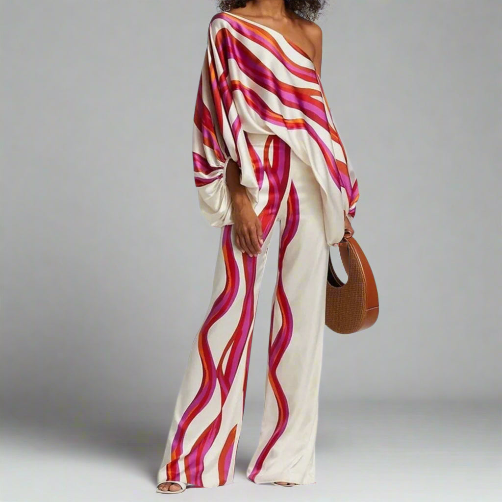 De Claudia™ set is een explosie van stijl en attitude, ontworpen voor vrouwen die durven op te vallen. Met een exclusieve, golvende print in levendige tinten roze, oranje en rood op een zachte, gebroken witte achtergrond, straalt dit ensemble pure elegantie en flair uit. De asymmetrische top met brede mouwdetails zorgt voor speelsheid en beweging, terwijl de uitlopende broek de silhouet verlengt en flatteert. Perfect voor zomerse feestjes, vakantielooks of elke gelegenheid waar je stijlvol en comfortabel wilt schitteren.