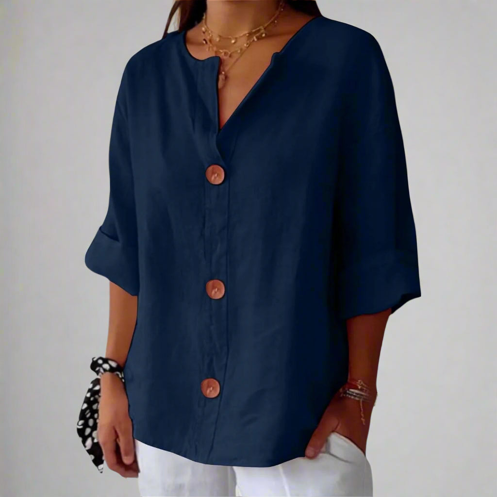 Deze luchtige linnen blouse is speciaal ontworpen voor jou – een vrouw die comfortabel wil zijn zonder concessies te doen aan stijl.