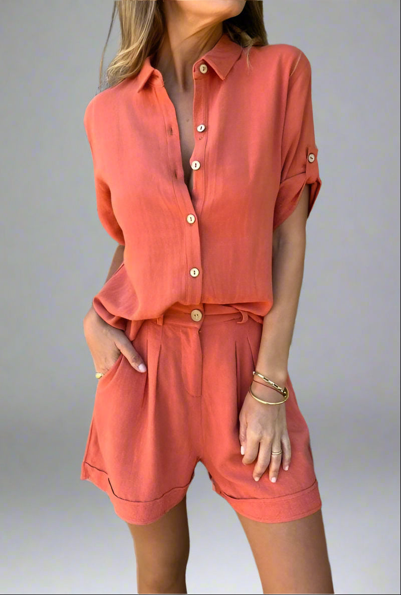 Deze set is gemaakt van hoogwaardig katoen en linnen en voelt zacht en ademend aan op de huid, ideaal voor warme lente- en zomerdagen. De blouse heeft een klassiek design met verfijnde details, terwijl de bijpassende broek zorgt voor een comfortabele en stijlvolle pasvorm. De Pauline-set is perfect voor een verfijnde casual look of chique kantoorkleding en is een veelzijdige keuze die tijdloze charme combineert met moderne functionaliteit.